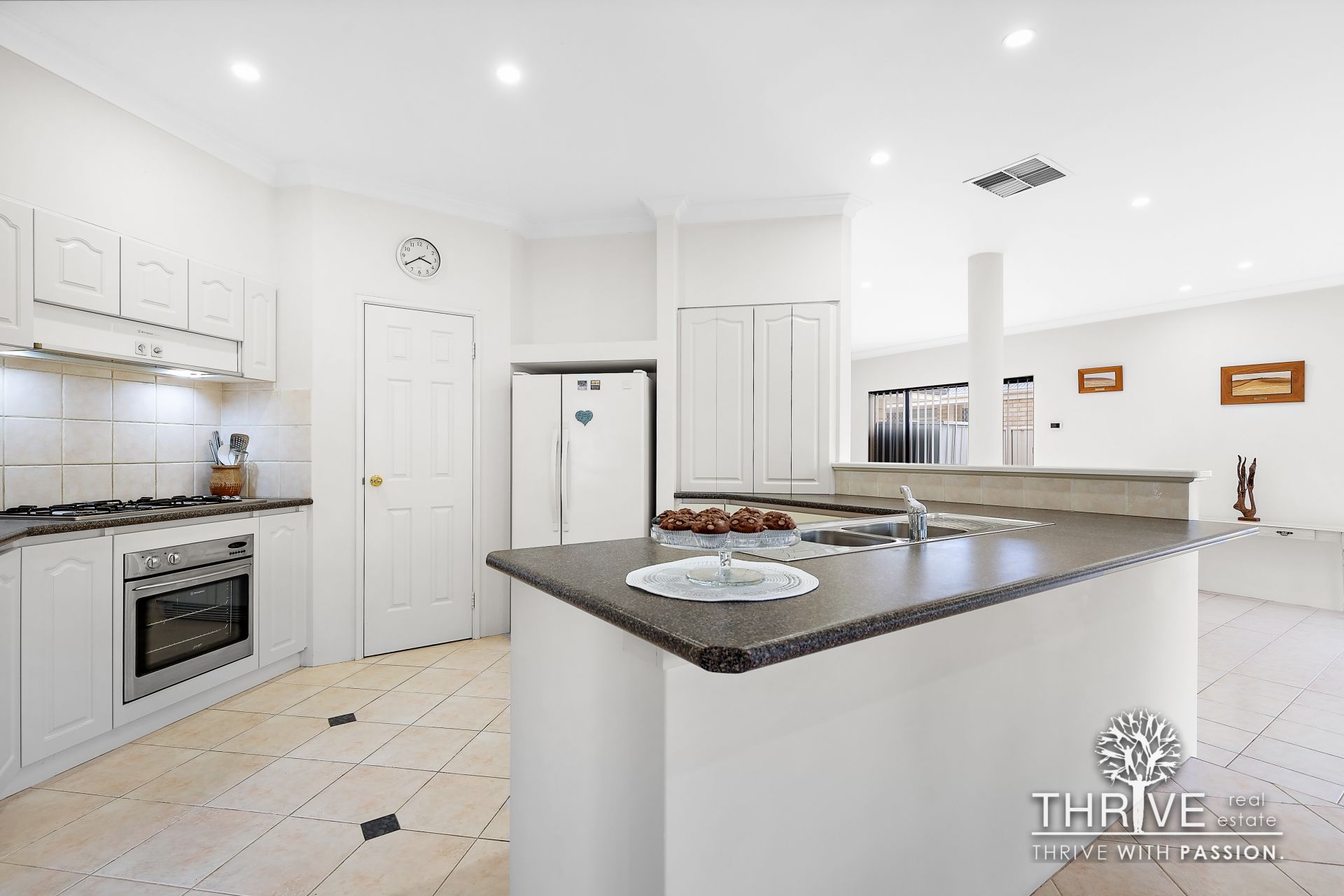 A large chef's kitchen is perfectly positioned between the family living zone and formal dining, and features an electric oven, gas cooktop, rangehood, fridge, dishwasher recess, breakfast bar, appliance cupboards, and a multitude of cupboard space including a walk-in pantry.