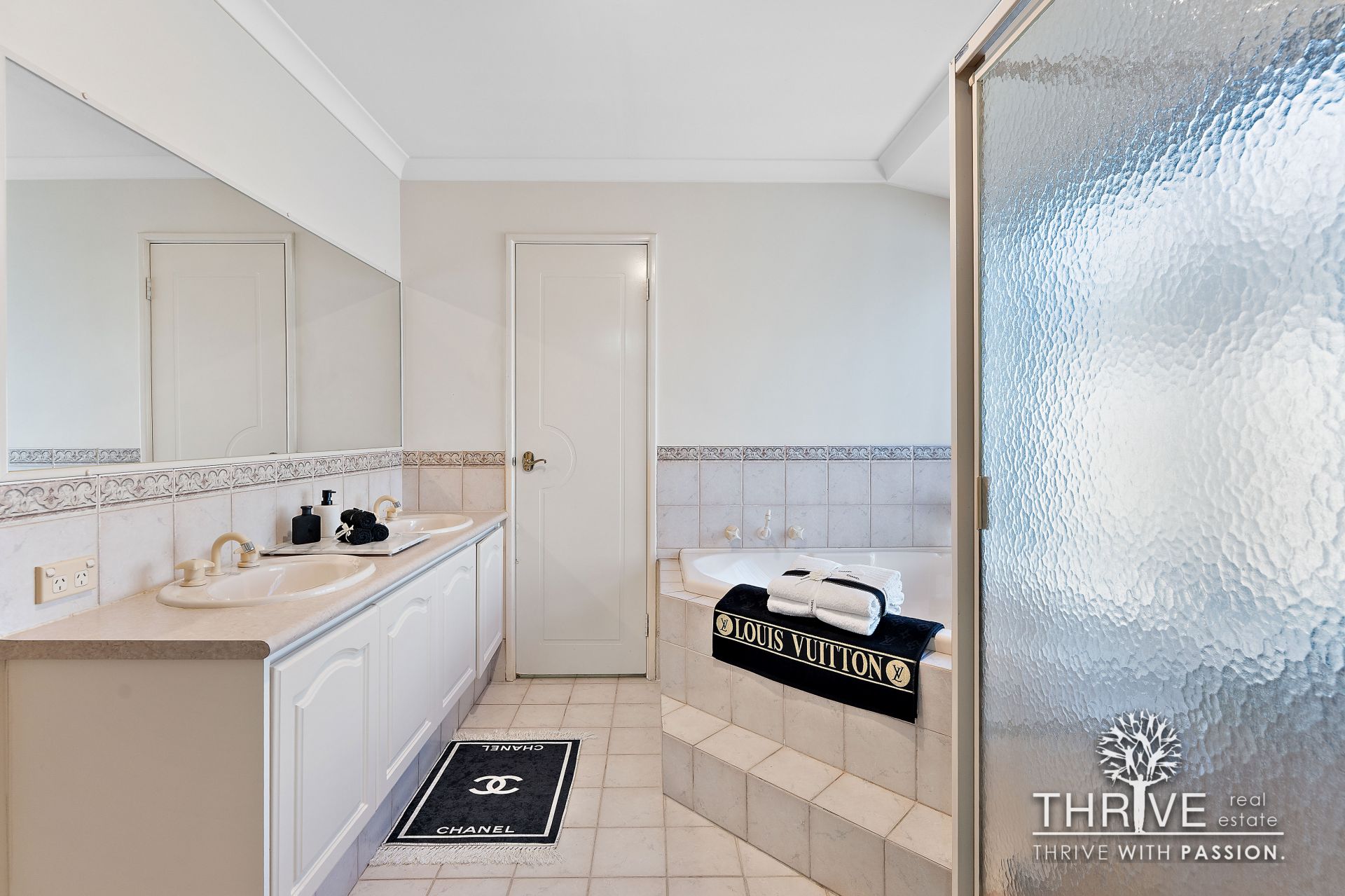 The king sized master bedroom enjoys the glorious front garden views, and encompasses a spacious walk-in robe and glamorous ensuite with a corner spa, large shower, twin vanity basins and powder room.